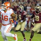 Facing a first down with just over two minutes to play, Clemson quarterback Deshaun Watson hit a wide-open Leggett down the sideline. Leggett evaded Florida State defenders and made a diving leap with the ball extended to the end zone.