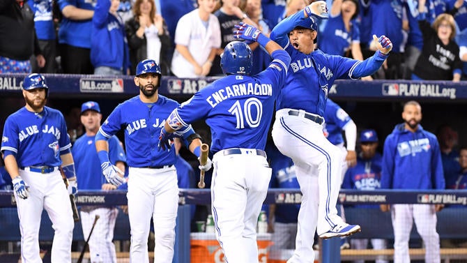 In his second time up, he smoked a single up the middle, cashing Josh Donaldson to put Toronto ahead 5-2 in the third. Encarnacion's Sunday night slugfest continued an assault on the league that's intensified as the stakes have grown. The 33-year-old slugger batted .263/.357/.529, tying a career high with 42 homers and leading the league with 127 runs batted in (if you're into that kind of thing). Edwing's first-inning shot marked the first time in the Blue Jays' 40-year history that a player had hit three home runs in the team's first four playoff games.