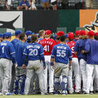 Things between the Rangers and Blue Jays got very heated Sunday night in Texas. Jose Bautista was plunked in apparent retaliation for his ALDS bat flip, then Bautista slid in hard at second base on a take-out slide. Rougned Odor responded with a shove and by punching Bautista square in the jaw.