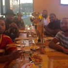 LeBron, the Larry O'Brien trophy and his friends have a nice meal together