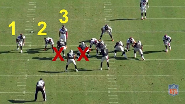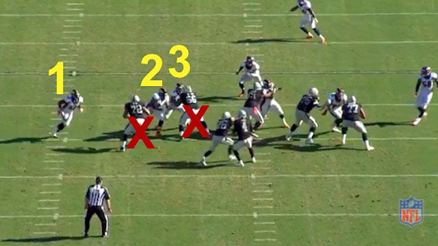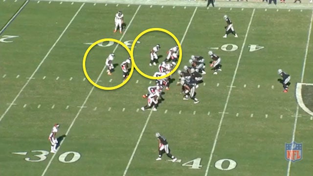 With two receivers outside for the Raiders against Denver’s off-man coverage, it made for tough running inside. This is risky, but when you have corners like Harris Jr. and Talib, it’s possible.