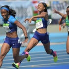 Allyson Felix and English Gardner had issues with their handoff caused by contact with a Brazilian runner