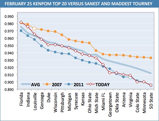The bottom line is that we could see a tourney where there are lots of upsets in the Round of 64, maybe just a couple in the Round of 32, and then relative chalkiness from there on in. Of course, the vulnerability of the three through six seeds depends on the quality of the teams seeded six through 13. That’s essentially the 21st through 52nd best teams in college ball. After Selection Sunday, I’ll do a curve of the actual teams in their actual seeds and we’ll have a better picture of how the tourney might play out.