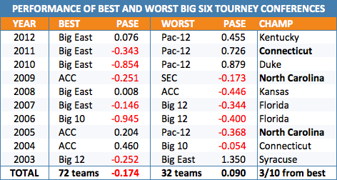 There is some evidence that teams playing tough schedules underperform in the tourney. Since 2003, the 84 teams with SOS ratings in the top 10 have underachieved at a -.122 PASE rate. Regardless of the season, the results are undeniable: the Big East was the pre-eminent conference in the nation over those two years -- and they laid a big March Madness egg.