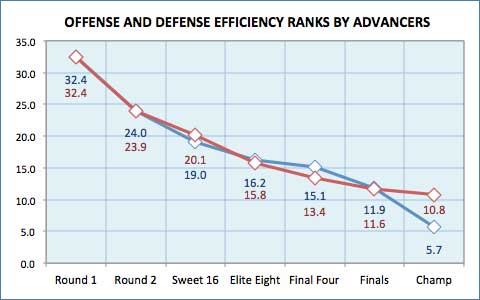 The offense and defense efficiency rankings of tourney advancers are pretty close to each other all the way to the final. (Remember: a higher number here is worse.) Defense holds a slight edge over offense in four of the first five rounds. Only Sweet 16 advancers have a better ranking in offense than defense. But the number that really jumps out here is the relative rankings of the champions. Tourney winners are much higher ranked offensively than defensively -- a gap of five positions. In fact, the gradually flattening curve for defense suggests that, while you need a solid defense to advance in the dance, defense can only take you so far. On the other hand, you have to have an elite offense to cut down the nets.