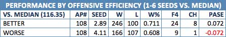 Now take a look at the comparison of high seeds above and below their offensive efficiency median:
