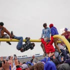 LOOK: Kansas fans throw goal post into lake following historic upset over No. 6 Oklahoma