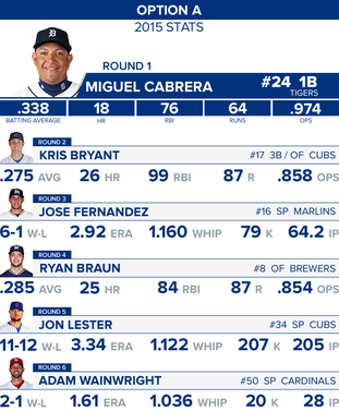 The conventional move here might be to take an outfielder or starting pitcher in Round 2, but this is probably your one and only chance to draft Kris Bryant. As the Jose Fernandez and Ryan Braun picks in Rounds 3 and 4 show, your cupboards won't exactly be bare at those positions if you take the leap to draft Bryant before them.