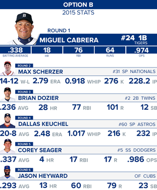 Want a Cy Young winner as your No. 2 starter? Dallas Keuchel might still be there for the taking in the fourth round. By the fifth round, you have probably missed the boat on a true No. 1 outfielder, so you could add to your star-studded infield by getting Corey Seager to fill in as your shortstop. Jason Heyward is far from ideal as a No. 1 outfielder, but he's probably your best bet in Round 6. It might not feel good putting Heyward at the top of your outfield depth chart, but remember that you have added loads of value by drafting Cabrera, Dozier and Seager for your infield.