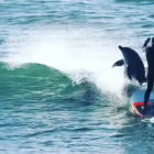 That's a textbook hit right there. The dolphin doesn't lead with the crown or target too high. No, it makes an exceptional body-on-body hit that completely separates the paddler from his board. Beautiful stuff.
