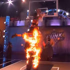 Immediately after the dunk, the human fireball was pulled aside and extinguished, leaving the judges and crowd in awe.