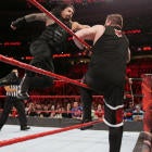 Outside the ring again, Owens set Reigns up on an announce table, climbed the barrier and hit a frog splash -- only for the table not to break. So what did Owens do? Frustrated, he climbed back up the barrier and hit a second frog splash, collapsing the table. Reigns barely beat the count back into the ring, but once he did, Owens hit a third frog splash -- this time from the top rope -- for a two count. Reigns bounced back with a sit-down powerbomb, but Owens thwarted a spear with a kick and Pop-Up Powerbomb; he only got a two count as Reigns placed his right foot onto the bottom rope, breaking up the pinfall.