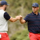 Elsewhere, D.J. and Woodland put away the sweet-swinging Scott-Oosthuizen crew 2&1 after the Internationals lingered longer than the Americans would have preferred. Cantlay and Schauffele beat Im and Smith by the same number; Im and Smith started with two birdies on the first two holes and didn't make another one the entire day. In the finale, An and Niemann trailed for the first 14 holes but gave themselves a birdie putt on No. 18 to win the match. An missed it, but they got another half point to go with the wild Leishman-Ancer half point and will go to the singles matches with a 10-8 lead.