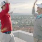 The two tried to pull off their signature juggle-and-hit off the top of the MGM Grand to a Top Golf target 125 yards away. This isn't super difficult in a vacuum because the target is so big, but I should remind you that they are several hundred feet in the air!