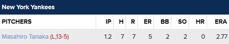 Ouch. Tanaka's defense didn't help, but still, seven hits and two walks while only recording five outs is ugly. He went from a 2.47 ERA to a 2.77 ERA in one afternoon.