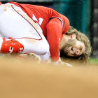 Harper had to be carried off the field and he could not put any weight on his left leg. After the game, manager Dusty Baker said Harper hyperextended his knee and will go for an MRI on Sunday.