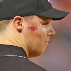 Fortunately, Valentine was able to remain in the game and work the full nine innings. By those late innings, he had a visible bruise on his upper cheek. Given the velocity on the throw -- big league shortstops by necessity throw very hard -- Valentine was fortunate he wasn't more seriously injured.