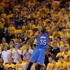 Havoc. Chaos. The Oracle crowd gathered itself for a collective cardiac event. Six-point game, less than a minute to go, Kevin Durant, with a pass from Russell Westbrook off his own offensive rebound, launches a three to cut the Warriors' once secure lead to within a single possession.