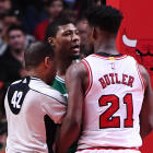During the first half of Game 4 between the Celtics and Bulls, Marcus Smart and Jimmy Butler got into a bit of a scuffle, as they exchanged a shove and some words.
