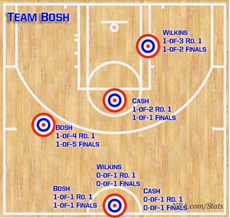 Wilkins was a career 31.9 percent 3-point shooter but the 3-point shot didn’t become a real weapon until halfway into his career. Bosh is a career 32.6 percent shooter from deep, but has only recently become a volume shooter. He’s making 37.5 percent of them this season. Cash is a career 28.0 percent 3-point shooter but has been instrumental in helping this team win multiple titles.