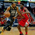 For this reason, the Pelicans, for the most part, have played Durant straight up, mostly with Jrue Holiday, while staying connected to shooters around the 3-point line and swarming Curry off every pick-and-roll. Holiday is a terrific defender and he'll win more than his share of possessions, but over the long haul he can't put a real dent in Durant. He's just too short. Durant can shoot over him, or just about any other isolated defender, any time he wants. Durant went for 38 in Golden State's 118-92 Game 4 win on Sunday to take a 3-1 series lead, and he did it almost exclusively out of the mid-range.