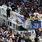 The players got off the fire truck after the incident and were put in a SWAT vehicle to finish their ride to Civic Center Park for the championship parade.