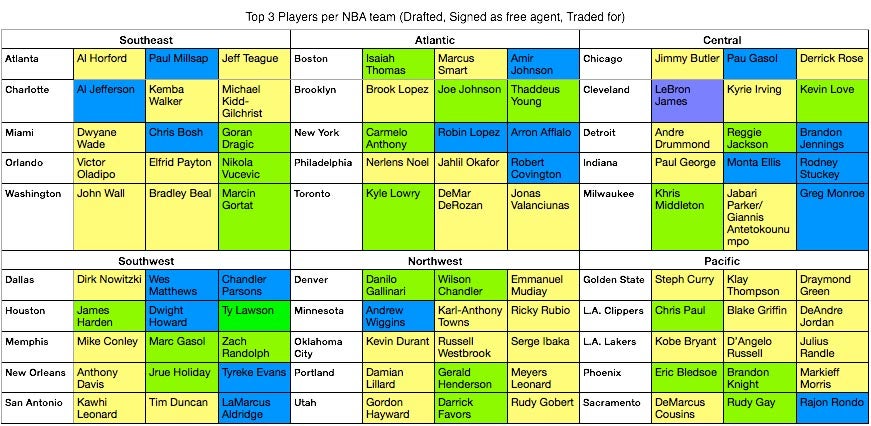 I took a look at each team's three best players, or at least as close as you can get to figuring out who those three guys are. Then I color coded them as follows: