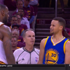 Then near the end of the game, James was hawking Stephen Curry as the Warriors inbounded the ball. LeBron was physical with Curry as he tried to deny him the ball, which led to Curry talking to the officials about the contact. LeBron and Steph then stood face-to-face and exchanged some words and some perturbed facial expressions.