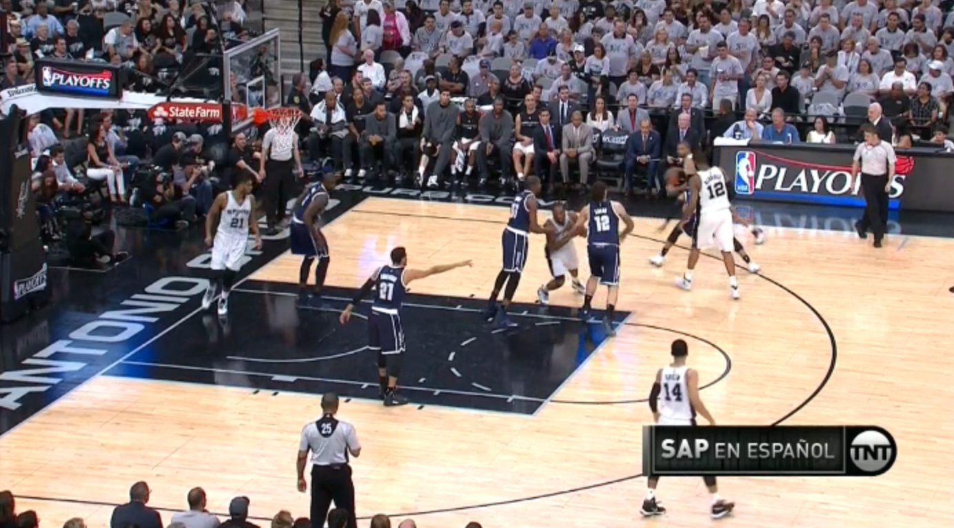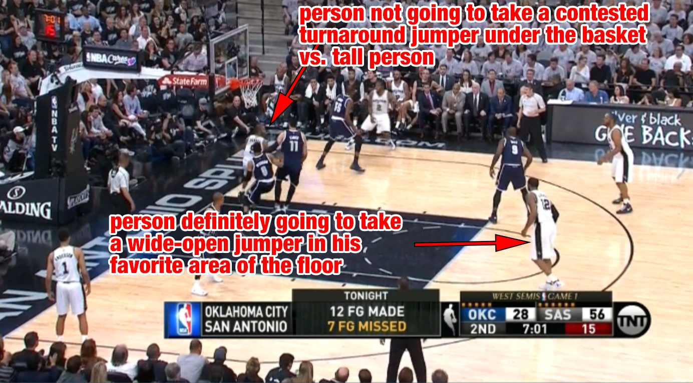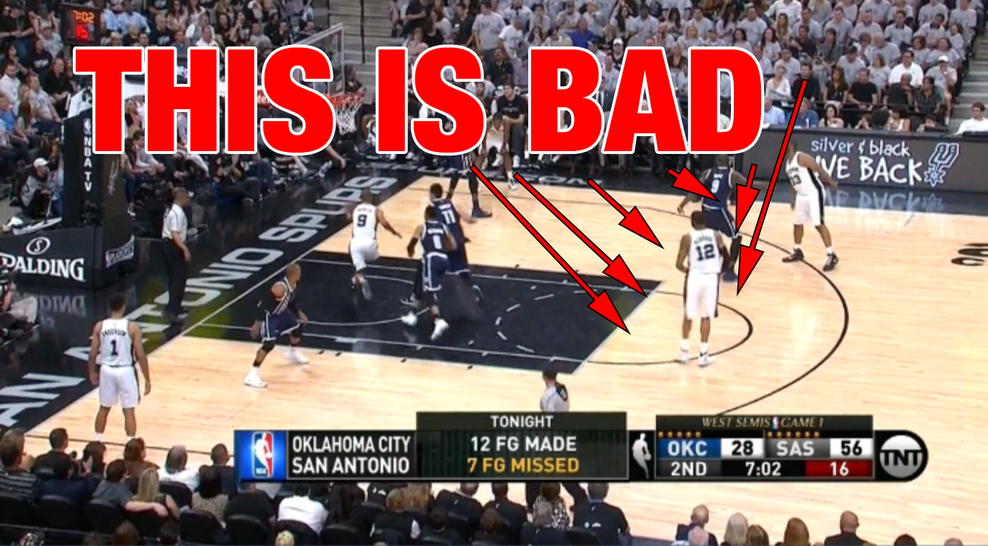 Against the Spurs, however, the Thunder went right back to hedging every time. They brought the big over on every single play, which meant that the big often had to drop two to three steps back to contain Parker and then try and get out to cover Aldridge on the pick and pop, and with how tall he is, it's just not survivable.