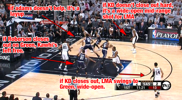 "A little bit better job" is right. This action was the start of the slide for the Thunder when their coverage unraveled against the Spurs' designed set. This unraveled OKC's entire defensive approach, and it began on the second San Antonio possession of the game.
