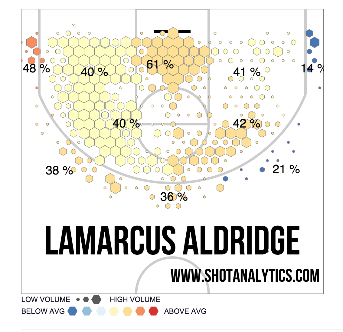 C) In a league that continues to evolve more and more toward efficiency, and despite the dinosaurs crying out as the meteor heads toward them, the mid-range jumper has never had less value. Yet here is Aldridge's shot chart: