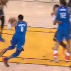 Driving to the basket, Westbrook made use of a Steven Adams screen, and with some space in front of him he appeared ready to explode to the basket. Before he could get off the ground, however, he slipped and careened toward the baseline. As he did, the referee whistled for a foul, despite the fact no one was really close to him.