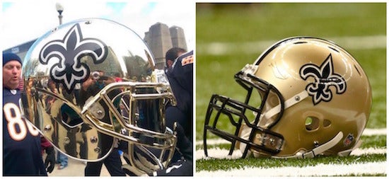 Here's what Mr. Saints fan's gold helmet looks like next to a standard Saints helmet.