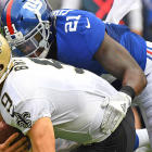 With a free run, Hall trips up Brees for the sack with Pierre-Paul there to finish him off just in case.