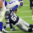 The sack wasn't the only impact play made by Smith, as noted above, but one in particular will probably make cornerback Chidobe Awuzie buy him a steak dinner with loaded mashed potatoes. The primary goal of Nolan is to generate intense pressure up front to help force takeaways in the secondary, and he got his wish at least once -- nearly twice (i.e., a near-miss from rookie Trevon Diggs) -- against the Rams. With the game still very much in grasp and the Rams threatening to move down the field yet again, Smith teleported into Goff's personal space on a stunt pass rush and forced a bad pass that led to an interception.