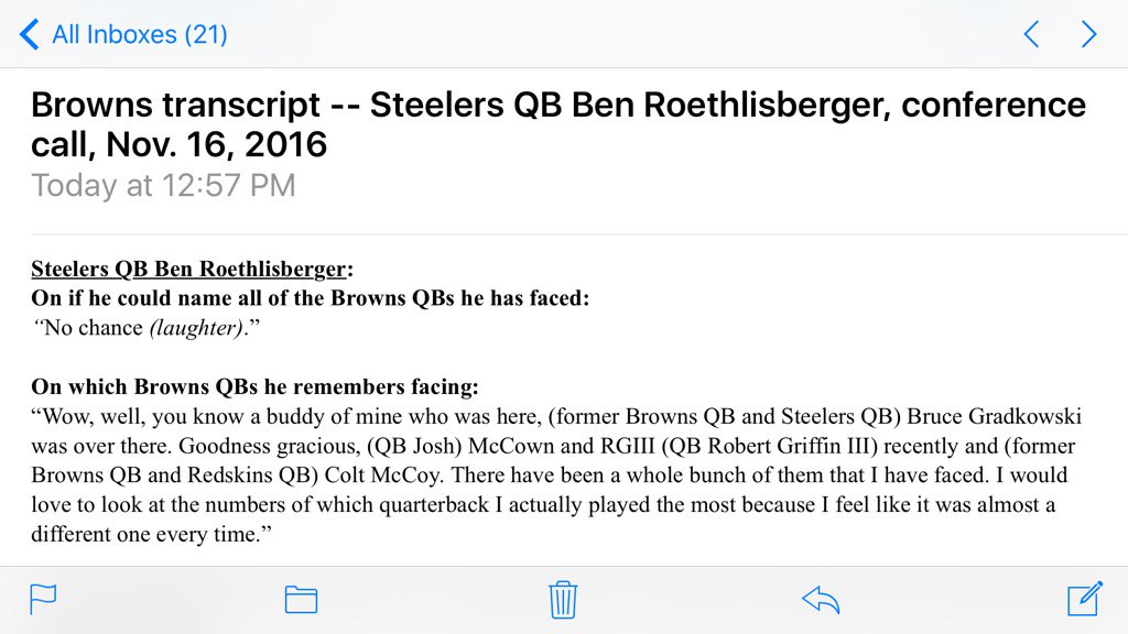 Also, when asked this week if he could name all the Browns QBs he's faced over the years, Roethlisberger offered up "no chance" before laughing.