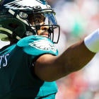Hurts also has the dynamic duo of A.J. Brown and DeVonta Smith at his disposal. They became the first pair of receivers to both eclipse the 1,000-yard plateau in the same season last year, with Brown recording 1,496 and Smith amassing 1,196. The 26-year-old Brown led the Eagles with 79 receiving yards against New England and the 24-year-old Smith hauled in Hurts' lone touchdown pass of the game. See which team to pick here.