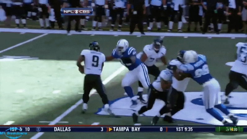 They all look exactly the same. Freeney jets upfield and attacks the outside shoulder of the tackle. Then he makes contract with his outside arm, using it as leverage to spin back inside and toward the quarterback. It's perfect.