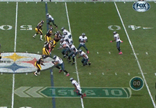 | Harrison, at the bottom, slows up before hitting Vick. |