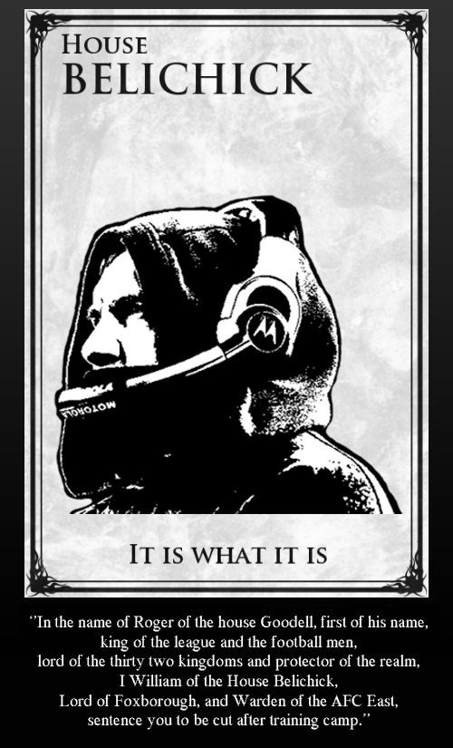 Which, of course, leads to this entertaining Belichick Coat of Arms (via Reddit). I don’t watch Game of Thrones, but if you do, I imagine this might be even funnier. (If you think you can do better, here’s your chance).