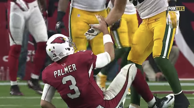 On a second-and-goal play from Green Bay's 7-yard line, Palmer was drilled by Matthews just after throwing an incomplete pass.