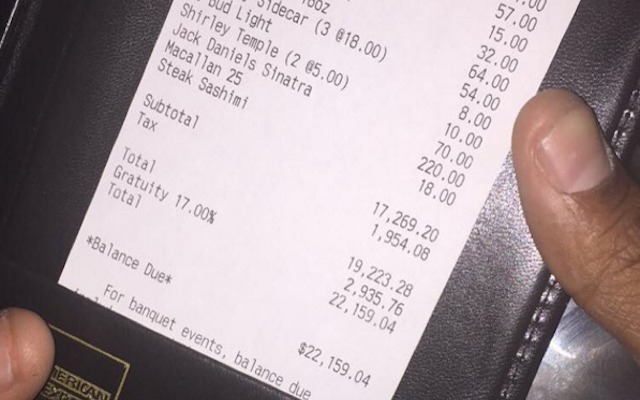 That $220 Macallan 25 scotch wasn't cheap, and let's not forget about those $5 Shirley Temples. They sound cheap, but trust me, those add up. The actual cost of the dinner was $17,269.20. With tip and tax, the total went up to over $22,000.