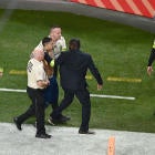 The fans sprinted onto the Allegiant Stadium grass from the corner of the Chiefs' end zone, nearly making it across the entire field before security swarmed, pinned them to the ground and escorted them out of the complex. The interruption occurred after the conclusion of the prior play, with about 5:19 left in the third quarter, and did not affect game play.