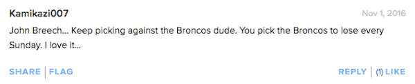 Speaking of drinks, Broncos coach Gary Kubiak could probably use a few after being forced to watch his own offense over the past few weeks. I'm not saying Trevor Siemian is not the answer for Denver, but I don't think Trevor Siemian is the answer. The game against New Orleans should actually give the Broncos a good gauge of whether or not Siemian should be the starting quarterback going forward.
