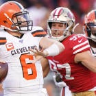 With the first half of Cleveland and San Francisco's Monday Night Football matchup coming to a close, the former Buckeye decided to get his revenge on the former Sooners star. Mayfield was rolling out to pass, but Bosa was able to grab ahold of him and forced him to throw it away. After taking him to the ground, Bosa ran down the field, motioned as if he was waiving a flag, speared the earth and planted that imaginary flag in a similar style to Baker all those years ago.