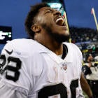 Before he went out of the game, he already had 200 scrimmage yards and a touchdown. His first touchdown was a 30-yard run in the second quarter to put the Raiders up 21-13.