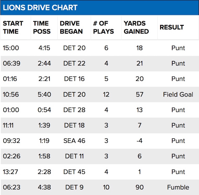 4. When will anyone score on the Seattle defense? Here's how the Detroit Lions' 10 offensive drives went tonight: