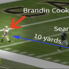 To recap: Cooks had two yards on Smith when he caught the ball at the Saints' 27-yard line. The lead grew to four yards by the time Cooks hit the Raiders' 45-yard line, and when Cooks crossed the goal line (and long after Smith had given up), the lead was some 15 yards.