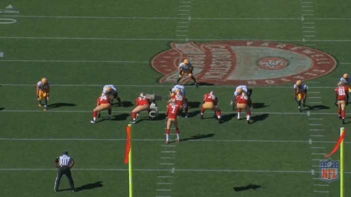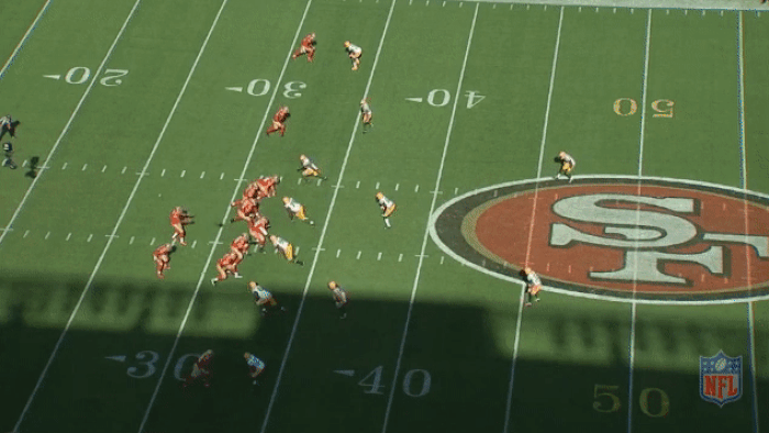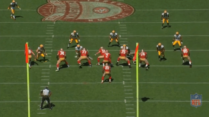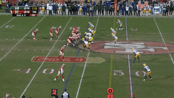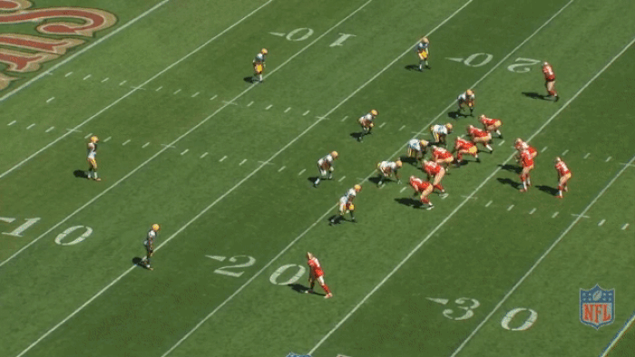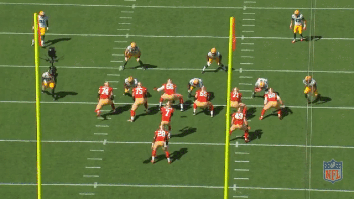 Below, the Packers attacked on a delayed blitz, which created a void in the middle of the field, right where a running back crossed from right to left. But Kaepernick hung onto the football, even though the back, again, called for the ball, even though it was the obvious answer to the blitz.