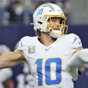 0:13Delivering just in time: Chargers QB Justin Herbert throws TD before halftime against Chiefs